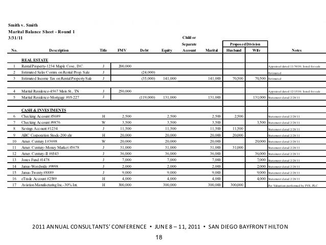 Divorce division of assets worksheet. Estate & Divorce Division Help Docs, free spreadsheets Worksheet - This worksheet can be used to determine how your property may be fairly divided in a divorce to reach a collaborative division, or to just view how things look when detailed and divided. Executors Checklist Checklist - Settling an estate, even a small one, requires a significant amount of time and attention to details. How to Divide Assets in Divorce: 15 Steps (with Pictures) Marital property, often called community property, are assets that were acquired during the course of the marriage. Whether it is tangible items such as furniture or intangibles such as investments or retirement accounts, all marital property is subject to equitable distribution or division as community property. [5] PDF MFS HERITAGE PLANNING > LIFE EVENTS Divorce Worksheet Use the worksheet on page 2 to figure out your household budget on either a monthly or annual basis. Assets Use the worksheet on page 3 to put together an overall inventory of your property and determine which assets you own. You'll also need to divide your marital property. States have different laws regarding property distribution. Illinois Property Division Worksheet | Sterling Hughes, LLC If you're ever unsure of the status of any of your assets, you should contact a lawyer to get as clear a picture as possible. Download our property division worksheet to begin understanding what your property division may look like and what you may need to give up in order to keep the house or your pension. For Immediate help with your family ...