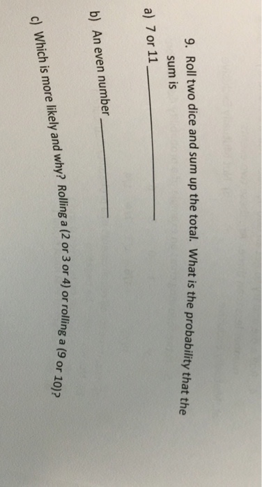 Probability for Rolling Two Dice - CCSS Math Answers Probability of sum of an even numbers = 18 / 36 = 1 / 2. 2. Two dice are rolled. Find the Probability of the sum of scores is an odd number? Solution: Two dices are rolled at a time. That is, X = {1,2,3,4,5,6} and Y = {1,2,3,4,5,6}. The total number of outcomes of two dices are 36. Add the scores of the two dices. That is