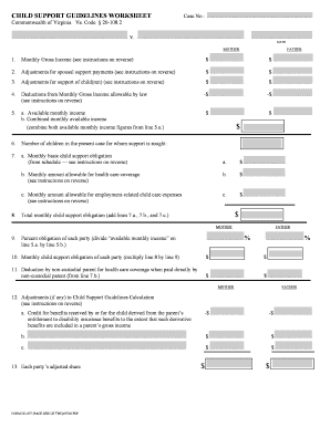 Virginia child support guidelines worksheet. PDF Form DC-637 CHILD SUPPORT GUIDELINES WORKSHEET ... - Judiciary of Virginia CHILD SUPPORT GUIDELINES WORKSHEET INSTRUCTIONS General — Use monthly financial information rounded to the nearest dollar in making these calculations. To convert data to monthly figures, ... that amount should be subtracted from that parent's child support obligation. Line 12 (b-c) (Virginia Code § 20-108.1(B)) ... PDF CHILD SUPPORT GUIDELINES WORKSHEET Case No - Judiciary of Virginia have been included in a parent's gross income, that amount should be subtracted from that parent's child support obligation. Line 12 (b-c) (Virginia Code § 20 -108.1(B)) — If applicable, describe adjustment to child support for factors not addressed in guidelines calculation, then show amount to be added to or subtracted from each party ... Child Support Guidelines Worksheet (Shared Custody) - Virginia - HandyPDF Lines 23 and 28 (Virginia Code § 20-108.2 (F)) - Any child-care costs incurred on behalf of the child or children due to employment of the custodial parent. shall be added to the basic child support obliga tion. Child -care costs shall not exceed the am oun t required to provide quality care from a licensed source. PDF CHILD SUPPORT GUIDELINES WORKSHEET Case No district court cases in which child support is at issue. b. This form is designed for use with the guidelines calculations provisions and procedures required by Virginia Code § 20-108.2. c. In completing Data Element Nos. 5 through 10, do not substitute data about a non-parental custodian who is a party for data about a parent who is not a ...