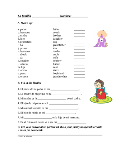 La Familia | NEH-Edsitement La Familia. "Familias Reales: La Familia de J.C." (2005). Even very young students know, and may occasionally use, words that are Spanish in origin—rodeo, tortilla, lasso, and macho, to name a few. And many are able to count from 1 to 10 in Spanish, due in large part to early exposure to the language provided by children's television programming. La Familia Family in Spanish Practice Activities La Familia Family in Spanish Practice Activities Earn 3.00 Reward Points $ 3.00 Save yourself time and give your students valuable practice! This pack of activities includes several ways for your students to practice with family vocabulary in Spanish! 8 pages - 6 MB - PDF Add to cart Add to Wishlist la familia worksheet in spanish pdf - Be Falcon Students will practice family vocabulary and grammar concepts by completing this self-guided and cognitively engaging vocabulary practice worksheet.This product is suggested for:Course: Spanish I or IIGrade levels: 7-12Unit of Study: La Familia (Family Relationships)Textbook: Realidades. Students explore language arts by reading a story in class. La familia en ingles interactive worksheet ID: 1982867 Language: Spanish School subject: Ingles Grade/level: Segundo Age: 8-13 Main content: The family Other contents: Add to my workbooks (960) Download file pdf Embed in my website or blog