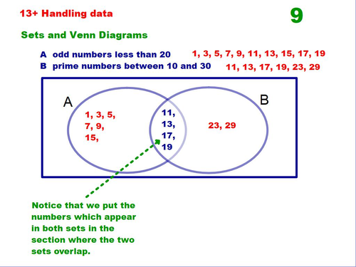 Venn Diagrams Worksheets | Questions and Revision | MME Use the Venn diagram to determine the following: a) The number selected is both odd and prime. Looking at the Venn diagram, we see that 4 4 of the 11 11 numbers are in both A A and B B, so the probability of a number being both odd and prime is, \dfrac {4} {11} 114 . b) The number selected is odd and isn't a prime number.