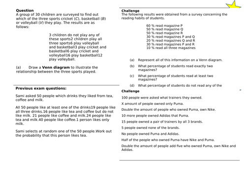 Venn Diagram Word Problems Worksheets: Three Sets These PDF worksheets contain 3-circle Venn diagrams without universal set. Study the Venn diagram and answer the word problems. Standard Word Problems - With Universal Set This section features extensive collection of Venn diagram word problems with a universal set for grade 7 and grade 8 students. Venn Diagram Probability - GCSE Maths - Steps, Examples & Worksheet There are also Venn diagram probability worksheets based on Edexcel, AQA and OCR exam questions, along with further guidance on where to go next if you're still stuck. ... Example 4: three set Venn diagram. 100 people in a community group were asked about which of the three hobbies they enjoy. The three hobbies were Sewing, Pottery and ... 3 Circle Venn Diagram Teaching Resources | Teachers Pay Teachers 3-Circle Venn Diagram Compare & Contrast Worksheet (With Fillable PDF) by Bilingual Classroom Solutions for SIFE and EBs 8 $1.45 Zip This three-circle Venn Diagram worksheet, which now includes a fillable PDF for digital/remote learning needs, is perfect for visually comparing and contrasting any three topics!