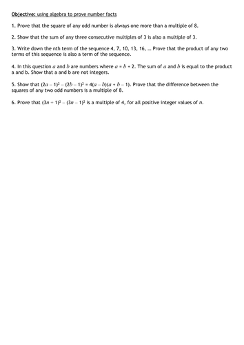 Proof Questions | Worksheets and Revision | MME Type 4: Algebraic proof. Algebraic proofs involve constructing an algebraic expression to match the statement, then proving or disproving the statement with this expression. This topic can get very challenging, but a simple example is shown below. Example: Prove algebraically that the sum of two consecutive numbers is odd. Step 1: Form the ...