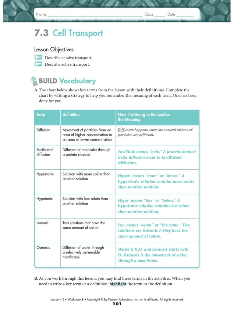 Answers To Cell Transport Worksheet - Free PDF File Sharing Answers To Cell Transport Worksheet. February 4th, 2013 19:37:22 PM ... Cell Processes Answers Worksheet Author: [email protected] Subject: [Filename: cell-processes-answers.pdf] - Read File Online - Report Abuse. The Cell: Transport Mechanisms and Cell Permeability Wet Lab Unit 3 Cell Transport - Mayfield City Schools Summative Assessment on the Cell Membrane and Transport HW: Rad 2.4 More + Friday 10/31 QOD: Describe passive transport and give 3 examples. HW: Ch. 7.3 worksheet; check answers with answer key posted on the right; STUDY for Quest on Monday. Thursday, 10/30. A cell has a 20% solute concentration in an environment of 80% water concentration.