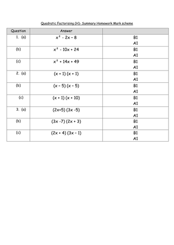 PDF Solve the Quadratic Equations by Factoring Worksheet # 1 Solve the Quadratic Equations Name:_____ by Factoring Score: /10 Solving Quadratics By Factoring Worksheet Answer Key Algebra 2 Algebra 2 Quadratic Formula Worksheet Answer Key. Substituting the first equation into the second gives 2 x^ {2}-x (x-2) =11 or x^ {2}+2x-11=0 . We then use our standard techniques for solving quadratic equations. This can be solved by completing the square, but it is probably easier to use the quadratic formula in this case. ... Factorising Quadratics - GCSE Maths - Steps, Examples & Worksheet What is factorising quadratics? Factorising, or factoring quadratic equations is the opposite of expanding brackets and is used to solve quadratic equations. For example, in the form of x 2 + bx + c requires two brackets (x + d) (x + e). How to factorise quadratics: Write out the factor pairs of the last number (c). PDF Solving Quadratic Equations by Factoring - Los Angeles Valley College Elementary Algebra Skill Solving Quadratic Equations by Factoring Solve each equation by factoring. 1) x2 − 9x + 18 = 0 2) x2 + 5x + 4 = 0 3) n2 − 64 = 0 4) b2 + 5b = 0 5) 35n2 + 22n + 3 = 0 6) 15b2 + 4b − 4 = 0 7) 7p2 − 38p − 24 = 0 8) 3x2 + 14x − 49 = 0 9) 3k2 − 18k − 21 = 0 10) 6k2 − 42k + 72 = 0 11) x2 = 11x − 28 12) k2 + 15k = −56