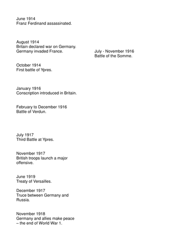 First World War Timeline Ordering Worksheet (teacher made) Investigate the chronology of the First World War with this timeline which features the key events and battles of the First World War. Check out this KS1 All About the Trenches PowerPoint. ... First World War Timeline Ordering Worksheet. 4.3 (3 reviews) British History 20th Century World War One. Free Account Includes:
