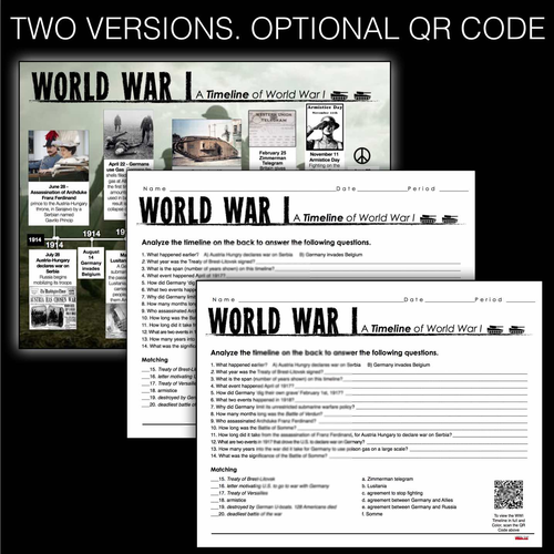Pin on World War 1 - Pinterest World War I Timeline takes your students to Europe from 1914 to 1919. Students analyze the timeline and complete a twenty question common core aligned worksheet. This assesses students on the history of the WWI as well as timeline analysis. An optional QR coded timeline is also included for more stu...