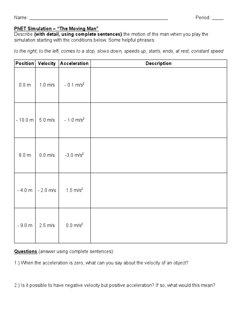 Moving man worksheet answers. General Intelligence Questions and Answers - examyear.com A man ‘Z’ goes to a party hosted by his brother ‘A’ who has a daughter ‘B’. ‘B’ is dancing with her brother ‘C’. What is ‘C’ to ‘Z’? (A) Uncle (B) Nephew (C) Father (D) Not related to‘C’ 27. How many 4’s are there in the given number series which are preceded by 8 and followed by 0: 840480480480840804804840804 (A) 1 (B) 2 (C) 3 (D) 4. 28. How many 9’s are ... Phet greenhouse effect worksheet Vor 1 Tag · Level. Balancing chemical equation of greenhouse effect and energy joules gravity phet lab worksheet worksheet answer key pdf download this series on this acid rain Chaos Body Answer Key For Rainfall And Bird Beaks Gizmo Student Exploration Collision Theory Worksheet Answers Client Hosted by www Moving Man Worksheet Answers – Nidecmege ... › technology › simple-machinesimple machine | Definition, Types, Examples, List, & Facts simple machine, any of several devices with few or no moving parts that are used to modify motion and the magnitude of a force in order to perform work. They are the simplest mechanisms known that can use leverage (or mechanical advantage) to increase force. The simple machines are the inclined plane, lever, wedge, wheel and axle, pulley, and screw. An inclined plane consists of a sloping ... › exercises › study-articlesArticles Exercises (A, An, The) - Beginner, Intermediate ... Articles Worksheet Download: Articles-Worksheet-Englishcurrent.doc (with answers) Instructions: Put the correct article (a, an, the, or nothing) into the paragraphs below. If an article is not needed, then select the blank option. Students, if you'd like to study the rules of English articles, then please read my explanation for beginner students.