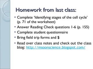 The Cell Cycle - CELLS alive At the end of this gap is another control checkpoint (G2 Checkpoint) to determine if the cell can now proceed to enter M (mitosis) and divide. Mitosis or M Phase: Cell growth and protein production stop at this stage in the cell cycle. All of the cell's energy is focused on the complex and orderly division into two similar daughter cells. The Eukaryotic Cell Cycle and Cancer - HHMI BioInteractive Sep 03, 2021 · The accompanying worksheets guide students’ exploration. The “Overview Worksheet” is intended to provide an introduction to the cell cycle as it relates to cancer. For a more comprehensive review of the cell cycle and the molecules that regulate each phase, use the “In-Depth Worksheet.” Search Printable 6th Grade Science Worksheets - Education Students explore the mechanics of the respiratory system in this life science worksheet for middle school. 6th grade. Science. ... The Cell Cycle: Mitosis Handout.