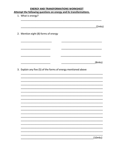 Forms of Energy Worksheet | Teach Starter A worksheet about the different forms of energy. Use this worksheet when students are learning about the different forms of energy. Students will match the definition to the different forms of energy, and then list the form (s) of energy that appear in specific real-world tasks. An answer key is included in the download.