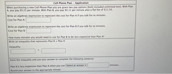Choosing a cell phone plan worksheet. interactive online meetings | Poll Everywhere Powering hybrid work and inclusive conversations. Seamlessly engage audiences across hybrid workspaces through live online polling, surveys, Q&As, quizzes, word clouds, and more. Host interactive online meetings | Poll Everywhere Actionable team insights. Visualize employee feedback in real time with a variety of activities — then measure engagement, follow up on feedback, and uncover next steps. › algebra › linear_equationSystems of Linear Equations in Real Life and their Solutions ... Worksheet on this webpage. Systems of Linear Equations Worksheets. What is a System? ... Choosing the best cell phone plan Step 1. At how many minutes do both ... Forms & Publications | Anne Arundel County, MD With almost 54,000 businesses, Anne Arundel County is a major hub of commerce and development. With a $35 billion economy, low taxes, a vast multi-modal transportation system, highly skilled workforce and excellent educational institutions, Anne Arundel County is the premier location to do business.