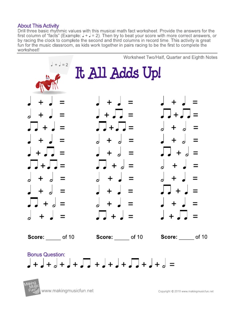 It All Adds Up Worksheet Three | PDF - Scribd About This Activity Drill three basic rhythmic values with this musical math fact worksheet. Provide the answers for the first column of "facts" (Example: . + . = 2). Then try to beat your score with more correct answers, or by racing the clock to complete the second and third columns in record time. it all adds up free music rhythm worksheet i - rhythm worksheets bundle ... If you are looking for it all adds up free music rhythm worksheet i you've visit to the right web. We have 100 Pics about it all adds up free music rhythm worksheet i like it all adds up free music rhythm worksheet i, rhythm worksheets bundle sets 1 5 by jooya teaching resources tpt and also note values worksheet. Here it is: It All Adds Up ...