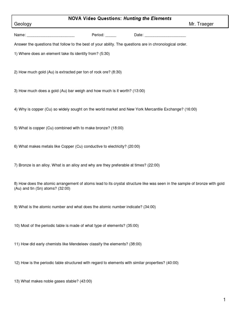 Nova hunting the elements geo - Physical Science NOVA Video ... - StuDocu Physical Science NOVA Video Questions: Hunting the Elements. Name: Patricia Collins Period: 2 Date: 6/7/ Answer the questions that follow to the best of your ability. The questions are in chronological order. Where does an element take its identity from? (5:30) - Gets its identity from tiny particles, its protons.