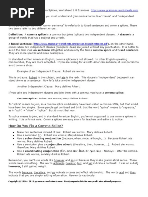 PDF Fragments, Run-Ons, and Comma Splices - Suffolk County Community College A. One of these sentences is a fragment . B. These sentences are correct . 3. Jonah, fleeing on a ship after he disobeyed God, eventually getting swallowed by a huge fish. A. This sentence is a fragment . B. This sentence is correct . 4. Moses was a prince. He sacrificed everything in order to save the Israelites. A. One of these sentences is a ... Comma Splice - Grammar Worksheets Worksheet 1 provides an explanation of comma splices, along with directions on correcting them. It includes eight sentences for students to work with. Worksheets 2 and 3 provide 16 exercises each , with ample space for students to write out the answers in complete sentences. Worksheet 1, Comma Splices, 8 Exercises PDF Comma Splices and Fused Sentences - San Jose State University For a comma splice, simply add a coordinating conjunction after the already present comma. For a fused sentence, add a comma and then a coordinating conjunction after the first independent clause. The new sentences add a clear, logical connector to the sentence, working with the comma to at once separate and link the clauses in the reader's mind.
