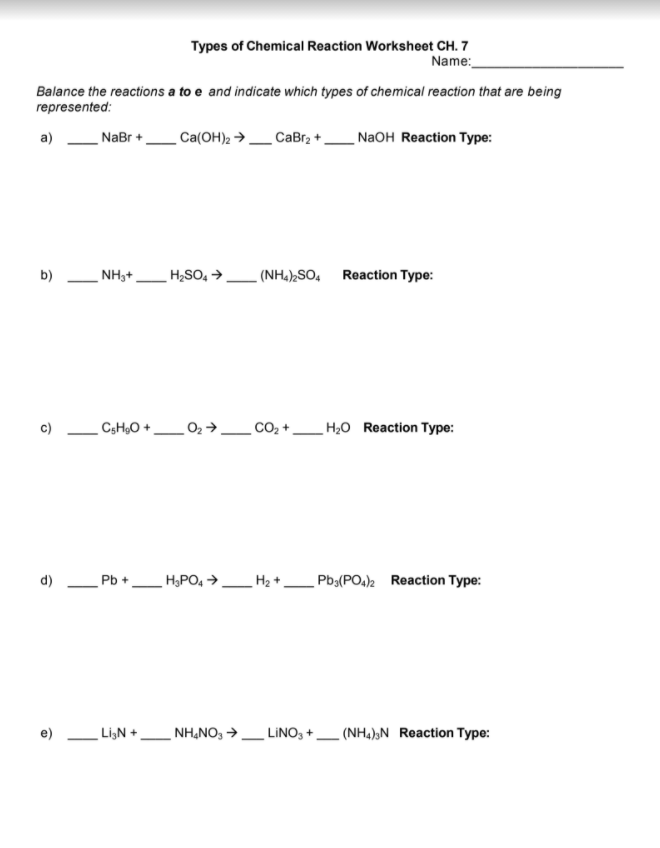 Get Free Identifying Reaction Types Worksheet Answer Types Of Reactions Worksheet Answer Key | Mychaume.-com Five Types of Chemical Reaction Worksheet Answers. Balance the following reactions and indicate which of the six types of chemical reaction are being represented: a) 2. NaBr + 1. Ca(OH)2 ( 1. CaBr2 + 2. NaOH Type of reaction: double displacement.
