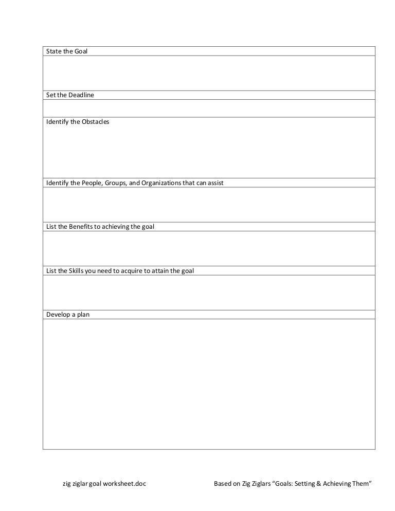 4 Free SMART Goal Setting Worksheets & Templates [2022 Update] Our first goal setting worksheet is the SMART goal setting worksheet. This is the best worksheet to use if you're an individual looking to skyrocket your goal efforts. I feel this is the most important goal setting plan of the bunch. It's extremely versatile and covers multiple areas while still being limited to a single sheet of paper.