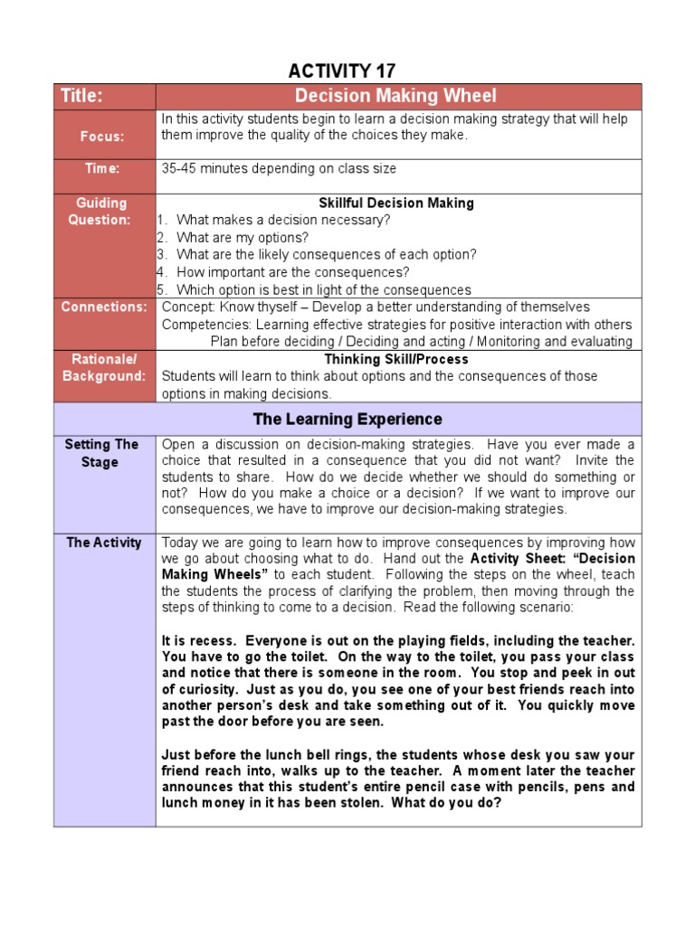› blog › best-decision-making5 Best Decision Making Activities for Middle School Mar 09, 2022 · Specifically, students learn about the decision-making process and then apply that knowledge to scenarios. To accomplish this, the activity is broken into two parts: First is the “poker chip activity,” in which you’ll highlight the importance of having as much information as possible prior to making a decision.