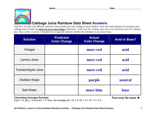 Ph of salt solutions worksheet answers. Reactions of metals with acids producing salts | Experiment ... Metal + acid → salt + hydrogen. This experiment is also a good opportunity for students to learn how to draw up suitable tables for recording experimental observations. In lesson 2, selecting zinc and sulfuric acid as the example to follow through to producing crystals of the salt is governed by the need to have a salt that crystallises easily. The pH Scale - Science Buddies Measuring pH can be done simply and quickly using pH test paper, pH indicator sticks, or a pH meter. pH test paper and indicator sticks are pieces of paper or stiffer sticks that contain pH indicators (chemicals that change color depending on how acidic or basic a solution is). To measure pH, a piece of pH test paper or an indicator stick is ... Freezing and Boiling Points - CliffsNotes Each formula unit of the salt, however, yields one Al 3+ and three Br – ions: AlBr 3 ( s) → Al 3+ ( aq) + 3Br – ( aq) So, the concentrations of the ions are . Al 3+ = 0.268 molal . Br – = 3(0.268) = 0.804 molal . Al 3+ + Br – = 1.072 molal . The total concentration of ions is four times that of the salt. Homogeneous Definition and Examples - ThoughtCo Jan 11, 2020 · "Homogeneous" refers to a substance that is consistent or uniform throughout its volume.A sample taken from any part of a homogeneous substance will have the same characteristics as a sample taken from another area.