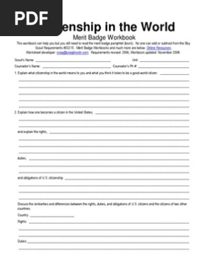 PDF Citizenship in Society - USSCOUTS.ORG Citizenship in Society - Merit Badge Workbook Page 9 of 10 11. Scouting strives to develop young people to be future leaders in their workplaces, schools, and community environments. As you look at your current involvement in school, your family, Scouting, your job, and/or community, think about how you can have a Bsa Merit Badge Worksheets Citizenship In The World The boy scouts of america thanks harry kreisler for his assistance with this new edition of the citizenship in the world merit badge pamphlet. Explain What Citizenship In The World Means To You And What You Think It Takes To Be A Good World Citizen. Other expiration dates for partial merit badges. Citizenship in the world merit badge march 7 2020. Citizenship in the World Merit Badge Helps and Documents - Scouter Mom Scouts explore what it means to be a member of the global community while working on the Citizenship in the World merit badge. They learn about international law and international organizations such as the United Nations, the World Health Organization, and the European Union. Scouts also find out about relationships between nations and the role of the US State Department and ambassadors. Citizenship in The World Merit Badge Worksheet | PDF | Boy Scouts Of ... Citizenship in the World. Merit Badge Workbook This workbook can help you but you still need to read the merit badge pamphlet. The work space provided for each requirement should be used by the Scout to make notes for discussing the item with his counselor, not for providing the full and complete answers. Each Scout must do each requirement.