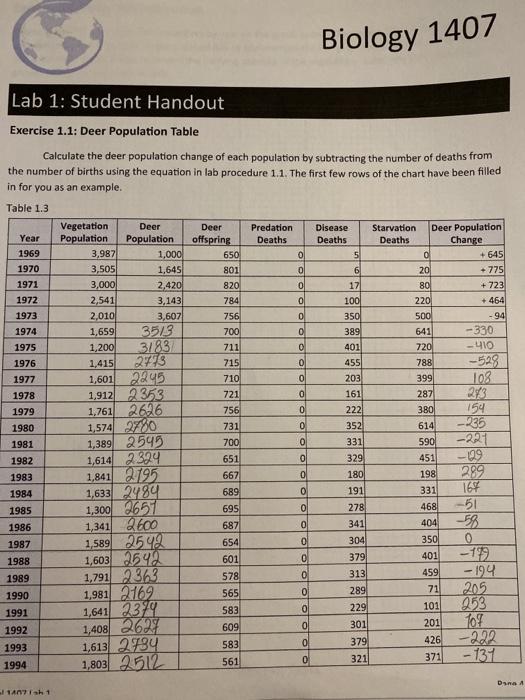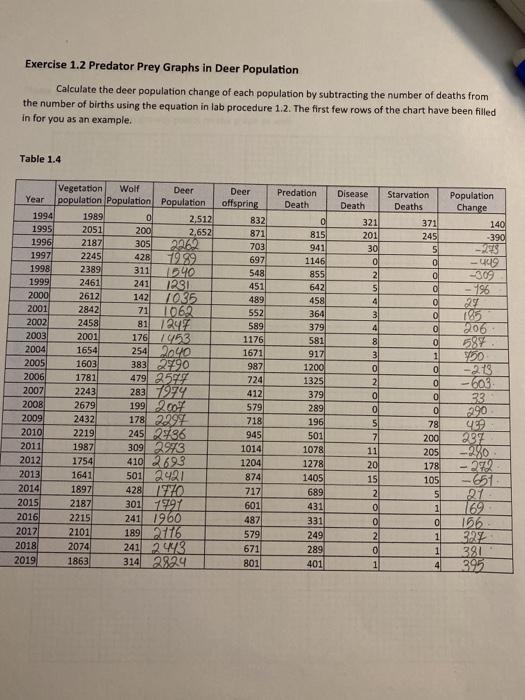 PDF Predator Prey Lab Exercise L1 - Hofstra University 1. The results of this program are shown in the following table. The Population Change is the number of deer born minus the number of deer that died during that year. Fill out the last column for each year (the first has been calculated for you). Year Wolf Population Deer Population Deer Born Deer Predation Deer Starvation Deer Population Change