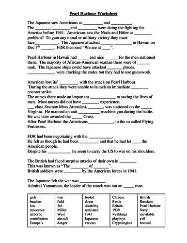 Pearl Harbor Missing Words Worksheet | Teaching Resources