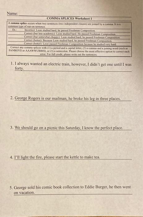 PDF Comma Splice Answer key/Teaching Tips, ... primary comma splice worksheet and the supplemental exercise sheet. Primary Worksheet Exercises: Each sentence below is wrong; it has a comma splice. Please correct it. 1. Each sentence below is wrong, it has a comma splice. Two sentences: Each sentence below is wrong. It has a comma splice. Semicolon: Each sentence below is wrong; it has a ... Run-ons & Comma Splices | UAGC Writing Center Five Ways to Fix a Run-on or Comma Splice Add a period and a capital letter Add a period and a capital letter to separate the sentences. Joseph Cornell was an innovative American artist known for his shadow boxes and collages. His art became more famous after his death in 1972. Add a comma and a coordinating conjunction Comma Splice - Grammar Worksheets Worksheet 1 provides an explanation of comma splices, along with directions on correcting them. It includes eight sentences for students to work with. Worksheets 2 and 3 provide 16 exercises each , with ample space for students to write out the answers in complete sentences. Worksheet 1, Comma Splices, 8 Exercises