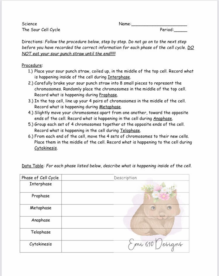 The cell cycle worksheet. Cell cycle regulators (article) | Khan Academy The core control system of the cell cycle. Cyclins, cyclin-dependent kinases (Cdks), and the APC/C. Google Classroom Facebook Twitter. Email. Regulation of cell cycle. Cell cycle control. Cell cycle checkpoints. Cell cycle regulators. This is the currently selected item. Loss of cell cycle control in cancer . Cancer and the cell cycle. Practice: Regulation of cell cycle. Sort by: … Interactive Cell Cycle - CELLS alive INTERPHASE. Gap 0. Gap 1. S Phase. Gap 2. MITOSIS . ^ Cell Cycle Overview Cell Cycle Mitosis > Meiosis > Get the Cell Division PowerPoints Mitosis Mover! A Cell Cycle Interactive - Bioman Bio Topics Covered: Cell Cycle, Interphase, Mitosis, Cytokinesis, Chromatin, Chromosomes, Role of the cell cycle in growth and healing. This is a short interactive useful for helping students understand the basics of the cell cycle and how one cell divides to … › cms › lib6THE CELL CYCLE WORKSHEET - Chandler Unified School District The diagram below shows six cells in various phases of the cell cycle. Note the cells are not arranged in the order in which the cell cycle occurs. Use the diagram to answer questions 1-7. Cells A & F show an early and a late stage of the same phase of the cell cycle. What phase is it? prophase . Which cell is in metaphase? C