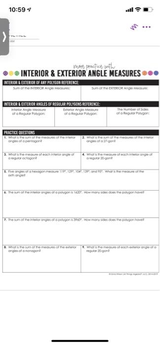 PDF 6-Polygons and Angles - Kuta Software Find the measure of one interior angle in each polygon. Round your answer to the nearest tenth if necessary. 1) 108 ° 2) 135 ° 3) 147.3 ° 4) 120 ° 5) 140 ° 6) 150 ° 7) regular 24-gon 165 ° 8) regular quadrilateral 90 ° 9) regular 23-gon 164.3 ° 10) regular 16-gon 157.5 ° Find the measure of one exterior angle in each polygon. Polygons Angle Sum Worksheets & Teaching Resources | TpT Geometry worksheet covering: • Polygons • Interior angle sums You will receive a worksheet as well as fill in the blank notes with the purchase of this resource. ... lesson where students will discover the Polygon Interior-Angle Sum Theorem by using protractors to find the sum of the measures of the interior angles of polygons and drawing ... PDF 8.2 Angles in Polygons - Murrieta Valley Unified School District Interior Angles of Regular Polygons Find the measure of an interior angle of the regular polygon. 21. 22. 23. Using Algebra Find the value of x. 24. 25. 44 8 858 71 8 2x8 3x8 65 8 76 8 75 44 8 54 8 x8 Sum of Interior Angle Measures Find the sum of the measures of the interior angles of the convex polygon. 8. 9. 10. Sum of Exterior Angles of A Polygon Worksheet Exterior angle = 70°. So, the measure of each exterior angle corresponding to x° in the above polygon is 70°. 5. Answer : In any polygon, the sum of an interior angle and its corresponding exterior angle is 180°. That is, Interior angle + Exterior Angle = 180°. (5x + 90)° + (3x - 6)° = 180°. 5x + 90 + 3x - 6 = 180.