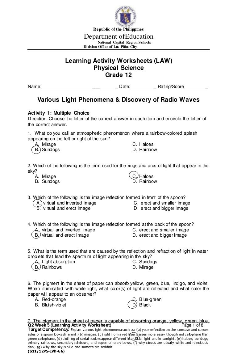 Color at light speed worksheet answers. Light worksheets and online exercises Light worksheets and online activities. Free interactive exercises to practice online or download as pdf to print. ... PS-16-07-Light and Color Grade/level: 8 by palmergm: UNIT TEST: Light & Shadow Grade/level: Grade 6 by teacheredmar: Light MA Grade/level: 4 by Arno85: Light Uses Grade/level: 1 Light Worksheet Flashcards | Quizlet A single particle or packet of light 3 x 10^8 m/sec The fastest speed in the universe, the speed of light. Prism Used to seperate white light into its colors. Light A wave that can travel through a vacuum EM Spectrum All light, visible and invisible. Energy Level An orbit of electrons, to move from low to high requires energy. Radio Waves Bill Nye Light Optics Flashcards | Quizlet When the glass is curved, the light going through it will be ________ as well. periscope. The object that allows you to see over or around things is called a. straight line. Light travels in a. bent, bounced, or absorbed. When light hits something it can be. gravity. Light can also be pulled by. PDF Name: KEY Period: Speed /Frequency / Wavelength 5. What is the wavelength of light with a frequency of 7.66 x 1014 Hz? -3.91 × 10 7 m 6. A helium laser emits light with a wavelength of 633 nm. What is the frequency of the light? (Hint: 1nm = 1.0×10-9nm) 144.74 × 10 Hz 7. What is the wavelength of X-rays having a frequency of 4.80 x 1017 Hz? 6.25 -× 10 10 m 8.