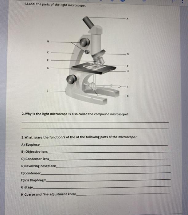 microbenotes.com › parts-of-a-microscopeParts of a microscope with functions and labeled diagram Sep 17, 2022 · Figure: Diagram of parts of a microscope. There are three structural parts of the microscope i.e. head, base, and arm. Head – This is also known as the body. It carries the optical parts in the upper part of the microscope. Base – It acts as microscopes support. It also carries microscopic illuminators. sciencespot.net › Pages › classbioThe Science Spot Parts of a Microscope Notes (pdf) - A basic lesson with an overhead key and student worksheet related to the parts of a microscope. Microscope Quiz 1 (pdf) - Student quiz on the parts of a microscope. Microscope Quiz 2 (pdf) - This quiz includes sections on labeling the parts of a micrscope as well as questions about power of magnification. The Microscope Parts and Use The compound microscope has two systems of lenses for greater magnification, 1) the ocular, or eyepiece lens that one looks into and 2) the objective lens, or ... Labeling a Microscope Answers Sep 7, 2015 ... Diaphram hamp. Microscope Labeling. Name . Key. FIEREDE. [Ocubr (Eyepiece).