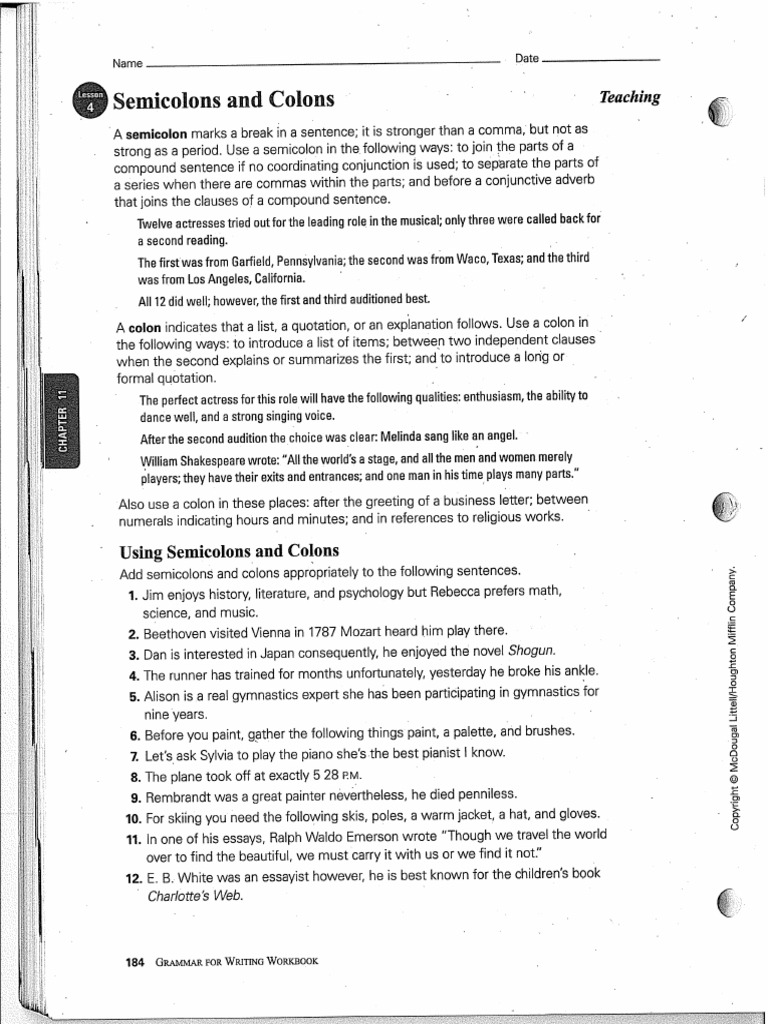 Semicolons and colons worksheet. Semi-colons worksheets | Teaching Resources Feb 22, 2018 · Three differentiated worksheets that focus on being able to use semi-colons, particularly between two independent clauses. These then move on to checking children's understanding through questions before the HA activity gets children to write their own sentences with semi-colons. 4th grade writing Worksheets, word lists and activities ... Colons, semicolons, and dashes . Colons, semicolons, and dashes . In this grammar worksheet, your child learns how to write sentences using a colon, semicolon, or dash. 8.3: Negative Messages – Communication at Work Learning Objectives. 3. Organize and write negative messages. i. Outline the structure of an indirect-approach bad-news message ii. Explain the importance of communicating bad news carefully in professional contexts Year 6 Punctuation: Colons, Semicolons and Dashes Learning ... Using Semicolons and Colons PowerPoint - KS2. Using Semi-Colons Worksheet. Semi-colons and Colons Quick Challenge. Year 6 Using Colons, Semi-Colons & Dashes to Mark ...