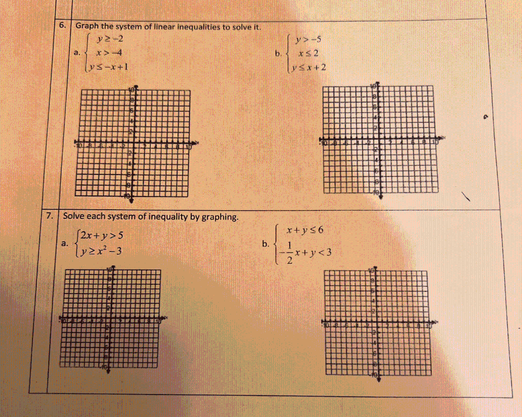 Graphing Linear Inequalities Worksheets - Math Worksheets 4 Kids This ensemble of printable graphing linear inequalities worksheets drafted for high school students assists in comprehending the use of inequalities when there is a range of possible answers. Identify the shaded region, and the type of boundary line as dashed or solid, complete the inequality, check if the ordered pair is a solution, identify the inequalities, shade the region, graph the inequalities and much more.