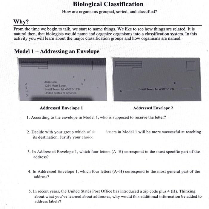 Biological Classification Essential Question: How are organisms grouped, sorted, and classified? ... KEY. Taxa. Country. USA. Kingdom. State and Zip MI, 48025-1234 Phylum.
