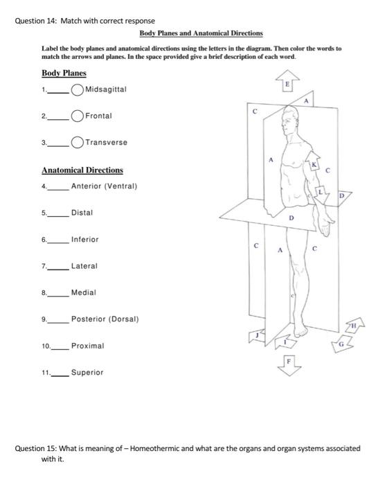 PDF Body planes and anatomical directions worksheet answers Body planes and anatomical directions worksheet answers Print answer key (only test content will be printed) 1. All descriptions of the body begin with the assumption that the body is in position. physiological anatomical directional 2. Which orientation terms have the opposite meaning? superficial and proximal distal and proximal medial and distal