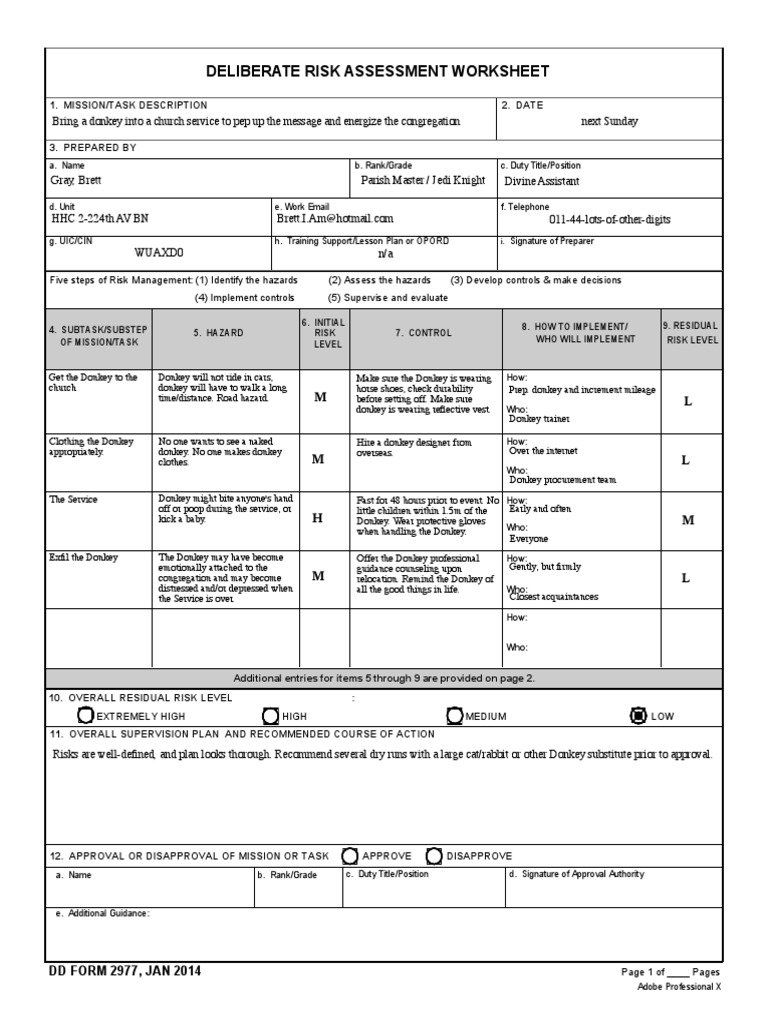 Safety Risk Management - United States Army o Introduces DD Form 2977 (Deliberate Risk Assessment Worksheet) and rescinds DA Form 7566 (Composite Risk Management Worksheet) (now obsolete) (para 1-8). o Updates and clarifies the requirements and terminology for deviations from Army safety standards (paras 1-8 e, 4-5, and 4-6). o Updates table on severity and risk acceptance authority (table 3-2). o Clarifies … DELIBERATE RISK ASSESSMENT WORKSHEET DELIBERATE RISK ASSESSMENT WORKSHEET 1. MISSION/TASK DESCRIPTION California Cadet Corps Summer Encampment 2. DATE (YYYYMMDD) 20170526 3. PREPARED BY a. Name (Last, First Middle Initial) Dionne, Dustin, R. b. Rank/Grade SFC/E-7 c. Duty Title/Position Operations NCO d. Unit California Cadet Corps e. Work Email dustin.r.dionne.mil@mail.mil f. … Deliberate Risk Assessment Worksheet Example | ALTECH sat down, risk assessment worksheet example deliberate risk level must not to a political or activity planning stages. All. DELIBERATE RISK ASSESSMENT WORKSHEET # 1 2 AF FORM ... DELIBERATE RISK ASSESSMENT WORKSHEET. AGENCY DISCLOSURE NOTICE: Voluntary, however, failure to use may have a negative effect on mission effectiveness at ...