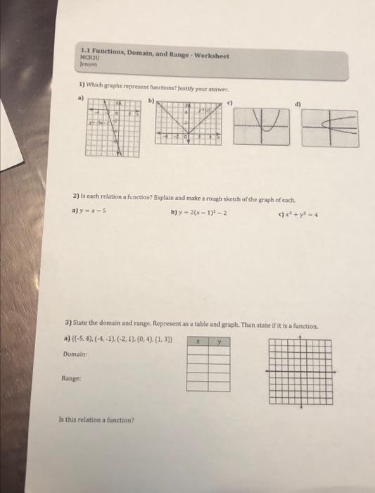 Domain and Range Worksheets - Math Worksheets 4 Kids This compilation of domain and range worksheet pdfs provides 8th grade and high school students with ample practice in determining the domain or the set of possible input values (x) and range, the resultant or output values (y) using a variety of exercises with ordered pairs presented on graphs and in table format. Function Tables And Graphs Worksheet Pdf | Brokeasshome.com Grade 4 Functions Worksheets With Answers Function Table 4th Identifying Functions From Graphs Worksheets 5 1 C Functions Graphs Linear Graphing Equations With Input Output Tables 7th Gr Math You Grade 4 Functions Worksheets With Answers Function Table 4th Function Worksheets Function Table Worksheets They express the inputs and similar outputs of a function. You can make these tables in vertical and horizontal (up down or side to side) pattern. In case of horizontal style of tables, there are two rows in which one expresses the similar outputs and the other one shows the input. You can also make this table with these details. Evaluating functions from a graph worksheet answers Date Period 1) Decide whether each of the following ordered pairs are solutions to the function f(x) = x + 5. Show all your work for full credit. o)(-3,8) b)(2.7) c)(0.-5) d)(5,0) 2) Use the table of values to graph the function . X f(x) = - 2(x+l)-4 f(x) (x,y) -8 0 i fu J -4 0 ~b 2 :.r. 5 r— ri R u (J 1 1 n i. 1 n 1 b > i 1 i f 1D.