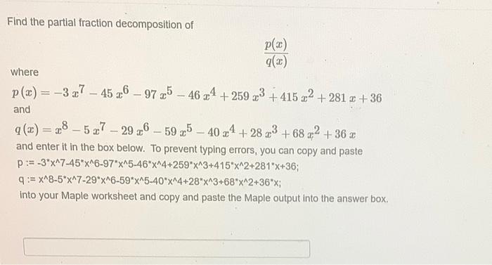 Algebra - Partial Fractions (Practice Problems) - Lamar University Section 5-5 : Partial Fractions. Determine the partial fraction decomposition of each of the following expressions. 17x−53 x2 −2x −15 17 x − 53 x 2 − 2 x − 15 Solution. 34−12x 3x2−10x−8 34 − 12 x 3 x 2 − 10 x − 8 Solution. 125+4x−9x2 (x −1)(x +3)(x +4) 125 + 4 x − 9 x 2 ( x − 1) ( x + 3) ( x + 4) Solution. 10x +35 (x+4)2 10 x + 35 ( x + 4) 2 Solution.