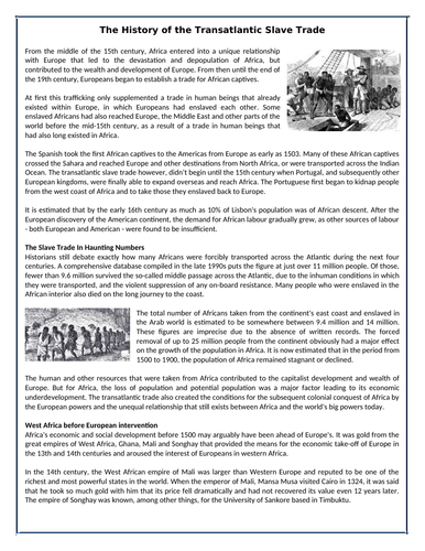 The Triangular Slave Trade Worksheets, Answers, lesson Plans The Atlantic Slave Trade Click the PDF symbol for an instant download Get Full Site Access The Slave Trade - fully resourced teaching unit. What: A study of the slave trade from its origins in Africa through to abolition in 1865. Highlights: Slavery on Trial: A fully resourced mock trial outline + source skills builder.