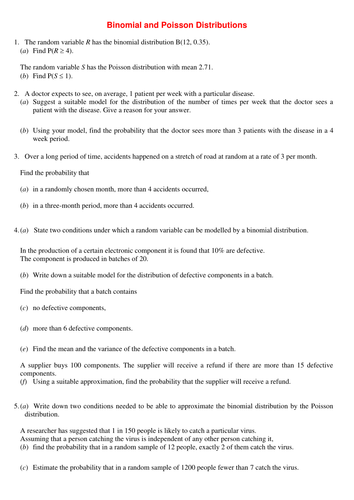 Worksheet Binomial Distribution Problems [qn85592eg1n1] Worksheet: Binomial Distribution Problems Problem 1. A manufacturer of electronics components produces precision resistors designed to have a tolerance of ±1%. From quality-control testing, the manufacturer knows that about one resistor in six is actually within just 0.3% of its nominal value. worksheet binomial distribution 30 Binomial Distribution Worksheet Answers - Free Worksheet Spreadsheet. 16 Pictures about 30 Binomial Distribution Worksheet Answers - Free Worksheet Spreadsheet : 30 Binomial Distribution Worksheet Answers - Free Worksheet Spreadsheet, A-level (Post 16) Statistics Revision Worksheets by mohmahm - Teaching Resources - Tes and also Statistics and Probability: COMPUTING THE MEAN OF A DISCRETE ... PDF Binomial and Geometric Worksheet - shortened Binomial and Geometric Worksheet Name _____ 1. A manufacturing process produces, on the average, 3% defective items. The company ships 12 items in each box and wishes to guarantee no more than one defective item per box. What is the probability that the box will fail to satisfy the guarantee? 2.