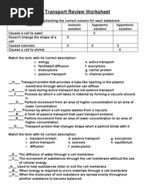 Cell Transport Review KEY - Cell Transport Review Worksheet Complete ... Full answer key in cell transport cell transport review worksheet complete the table checking the correct column for each statement: statement causes cell to ... _____ The diffusion of water through a cell membrane _____ The movement of substances through the cell membrane without the use of cellular energy _____ Used to help substances enter ...
