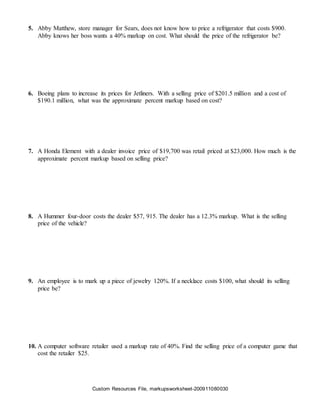 cdn.kutasoftware.com › Worksheets › PreAlgMarkup, Discount, and Tax - Kuta Software Markup: 70% 4) Cost of a CD: $14.50 Markup: 30% 5) Cost of an MP3 player: $129.50 Markup: 60% 6) Cost of an oil change: $21.95 Markup: 65% 7) Cost of a pen: $0.95 Markup: 60% Markup: 75% 9) Original price of concert tickets: $100.00 Discount: 21% 10) Original price of a book: $18.50 Discount: 45% 11) Original price of a telescope: $99.99 ...