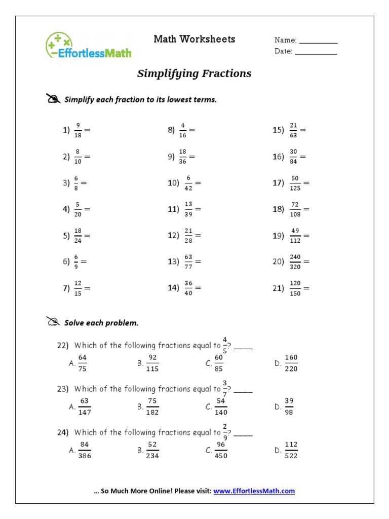 Simplifying Fractions Worksheet - Math Salamanders Simplifying fractions is also sometimes called reducing fractions to their simplest (or lowest) form. This involves dividing both the numerator and denominator by a common factor to reduce the fraction to the equivalent fraction with the smallest possible numerator and denominator.