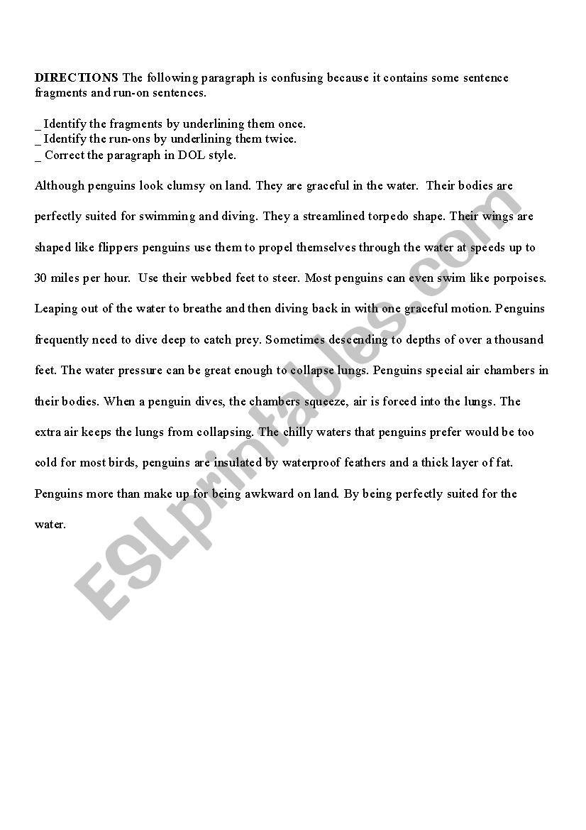PDF Fragments and Run Ons 9 Worksheets - Moore Public Schools DIRECTIONS The following paragraph is confusing because it contains some sentence fragments and run-on sentences. Identify the fragments by underlining them once. Identify the run-ons by underlining them twice. Rewrite the paragraph, revising each fragment and run-on to make the meaning clear. Although penguins look clumsy on land. They are graceful in the water.