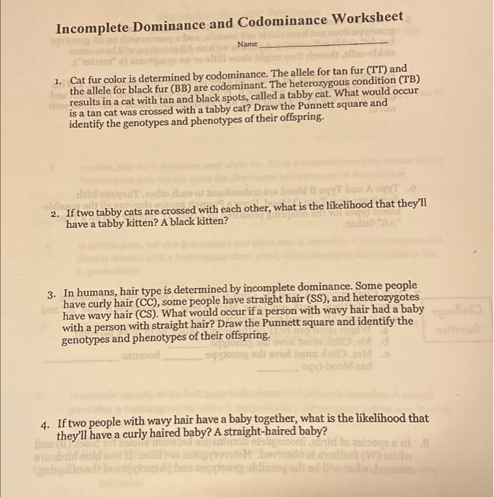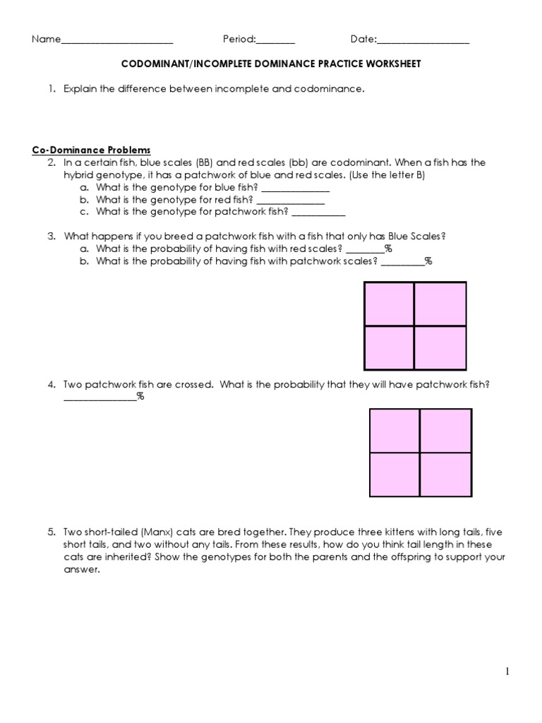 Incomplete and codominance worksheet. Codominance - Biology Online Dictionary 15/03/2022 · Codominance and incomplete dominance are examples. (2) In codominance, the alleles of a gene pair in a heterozygote are fully expressed. This results in offspring with a phenotype that is neither dominant nor recessive. As for the incomplete dominance definition, this form of inheritance occurs when the phenotype is intermediate to the phenotype of the … Exam 3 practice test Flashcards | Quizlet Study with Quizlet and memorize flashcards containing terms like Which of the following was not one of Mendel's main inferences from his research? A) The basic units of genetics are material elements. B) The genetic material elements come in pairs. C) Genes are lengths of DNA. D) The genetic material elements can retain their character through many generations. E) The genetic material elements ... amoeba sisters video recap answer key dna chromosomes genes … AMOEBA SISTERS ANSWER KEY Amoeba Sisters Video SELECT Recap: Incomplete Dominance, Codominance, Polygenic Traits, and Epistasis (Non-Mendelian Inheritance) Answer Key In some guinea pigs, having hair is associated with the presence of a dominant allele “H.” Hairless guinea pigs do not have the dominant allele “H.” This is a Mendelian trait. Some of the … 15.2 Angles In Inscribed Polygons Answer Key - Polygons and. 8 … Incomplete And Codominance Worksheet As Reading Worksheets — Db-excel.comSTANDARD G.C.A.2 GEO. Identify and describe relationships among inscribed angles, radii, and chords . Include the relationship between central, inscribed, and circumscribed angles; inscribed angles on a diameter are right angles; the radius of a circle is perpendicular to the …