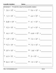 Scientific Notation Worksheets | Math Worksheets Scientific Notation Worksheet 1 RTF Scientific Notation Worksheet 1 PDF View Answers . Scientific Notation Worksheet 2 - You will be asked to convert numbers in standard notation to scientific notation, and vice-versa. Plus you'll compare the magnitude of two items and determine how many times greater one is than the other.