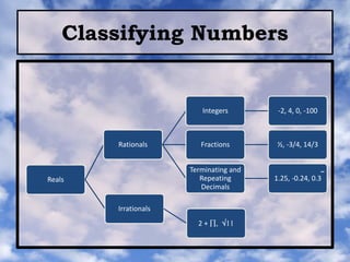 Classifying real numbers worksheet. › classifying-real-numbersClassifying Real Numbers - ChiliMath Natural numbers (also known as counting numbers) are the numbers that we use to count. It begins with 1, then 2, 3, and so on. It begins with 1, then 2, 3, and so on. Whole numbers are a slight “upgrade” of the natural numbers because we simply add the element zero to the current set of natural numbers. Classify numbers | Algebra (practice) | Khan Academy Practice classifying numbers as whole, integer, rational, and irrational. If you're seeing this message, it means we're having trouble loading external resources on our website. If you're behind a web filter, please make sure that the domains *.kastatic.org and *.kasandbox.org are … › worksheets › classifying-realClassifying Real Numbers Worksheets | Online Free PDFs - Cuemath Classifying real numbers worksheets are one of the most fundamental concepts from a mathematics point of view. Real numbers are those numbers that can be represented in a number line or a graph. The number, which has a negative radicand is not a real number, and it can't be represented in a number line (for example; 5√-3 is not a real number).