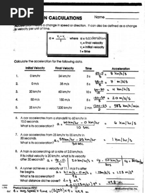 Speed Velocity And Acceleration Calculations Worksheet Bookmark File PDF Speed Velocity And Acceleration Calculations Worksheet ideal - and comprehensive - teaching and learning resource for National 5 Physics. In addition to the core text, the book contains a variety of special features: For Interest, Research Tasks, Activities,