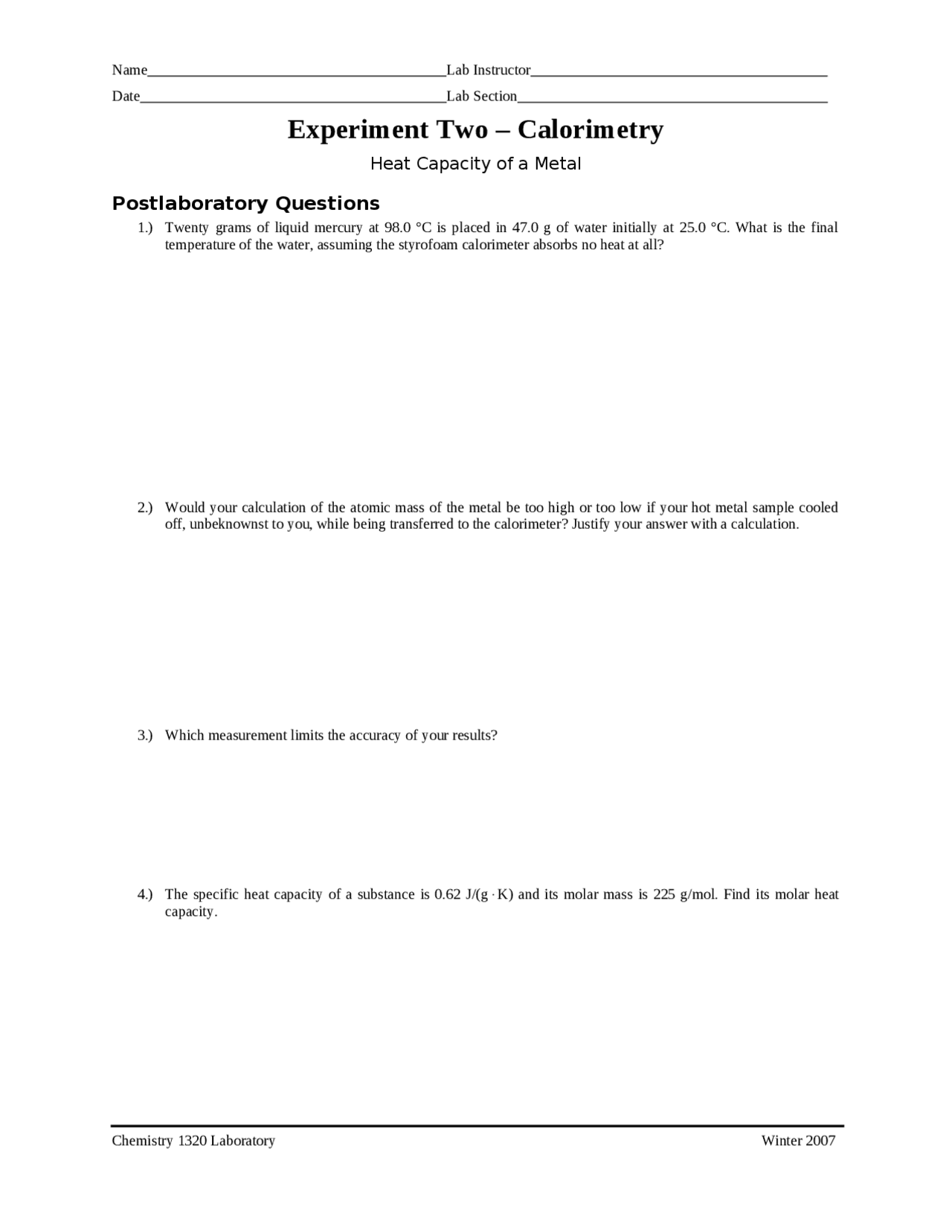 Heat Capacity Calorimetry Worksheet answers - StuDocu The energy absorbed by the water is q= m x cp x ∆T q= 75 x 4 J/g * C x (28 - 24) q = 1 x 10 3 J Therefore the energy lost by the object is -1 x 10 3 J So we can solve for the heat capacity of the object cp = q / m x ∆T cp = -1 x 10 3 J / 26 x (82 oC - 28) cp = 0/g * C