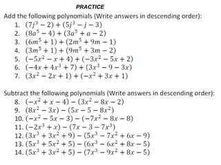 Add & subtract polynomials (practice) | Khan Academy Practice: Add & subtract polynomials. This is the currently selected item. Adding and subtracting polynomials review. Next lesson. Multiplying monomials by polynomials. Polynomial subtraction. Adding and subtracting polynomials review. Up Next. Adding and subtracting polynomials review.