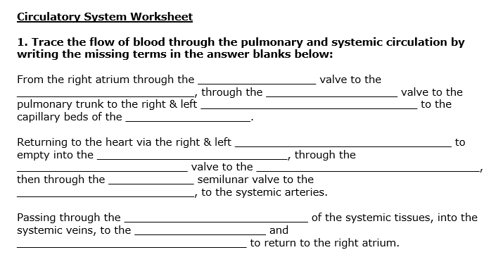 The Circulatory System Worksheet Fill in The Blank Answer Key DOWNLOAD THE CIRCULATORY SYSTEM WORKSHEET FILL IN THE BLANK AND GET THE ANSWERS Whether you prefer to learn by doing or have an answer key ready to go when you get stuck on a question, we have you covered. You're ready to tackle your practice test and need the answer key to your question bank. Don't worry - you're in good company!
